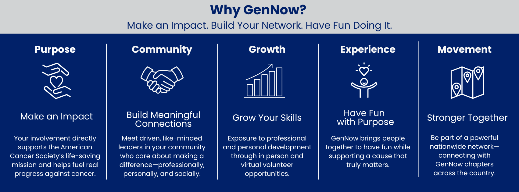 The American Cancer Society GenNow Network engages young professionals across the nation in the fight against cancer. These passionate individuals raise funds and awareness by leveraging their personal and professional networks, organizing mission – based activities, and fostering community partnerships. Members can make an impact through both in-person and virtual volunteering opportunities, while also benefiting from valuable networking and professional development opportunities.